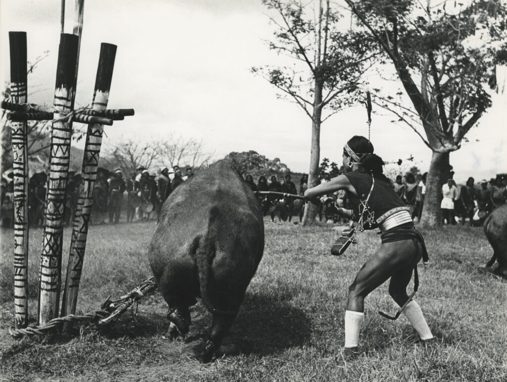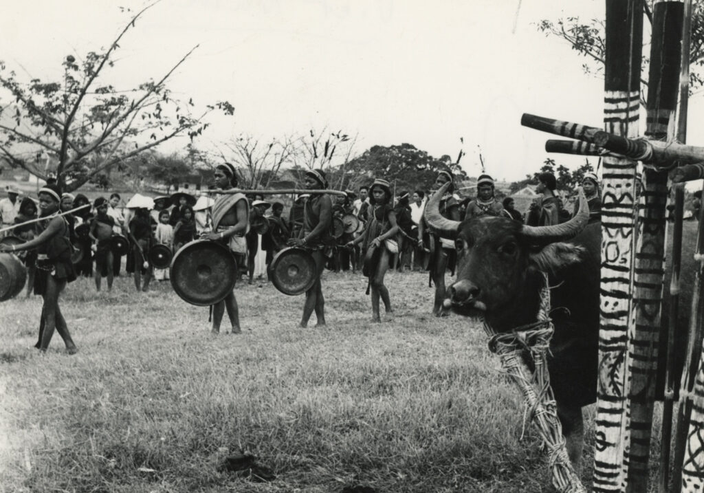 Si le sacrifice est occasionnel, le rite, lui, habite toute action, qu’il soit agraire, domestique, guerrier ou funéraire. Il recouvre à la fois des formules, paroles invocatoires mémorisées par les femmes et prononcées par les hommes, et une gestuelle. Le son du tambour, des gongs et autres instruments rythme les activités liturgiques, avec l’arrière-pensée qu’il aura peut-être une efficacité magique lui aussi.