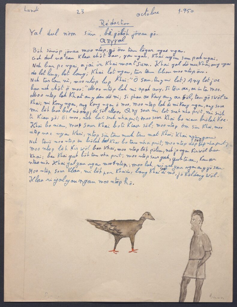 Le soir autour de la jarre ne résonnent pas seulement des rites ; des paroles voisines les prolongent. Dans les fumées de tabac vert, le conteur déroule les mythes, akhan, épopées porteuses de l’univers légendaire d’un peuple. Dournes s’est avidement emparé de ces récits entendus lors des veillées, comme d’indispensables clés de compréhension ethnologique. Pour obtenir le spontané plutôt que le provoqué, faire accepter l’usage d’un enregistreur, il lui faut gagner l’amitié des meilleurs conteurs. Pour transcrire et traduire, il sollicite les villageois les plus cultivés, si bien que l’ethnographié devient ethnographe. Une fois Dournes de retour en France, certains Jörai continueront d’ailleurs à lui envoyer des mythes transcrits par leurs soins.