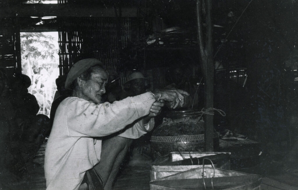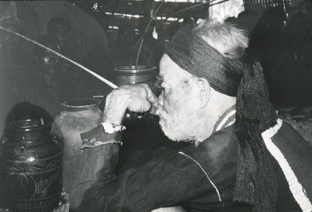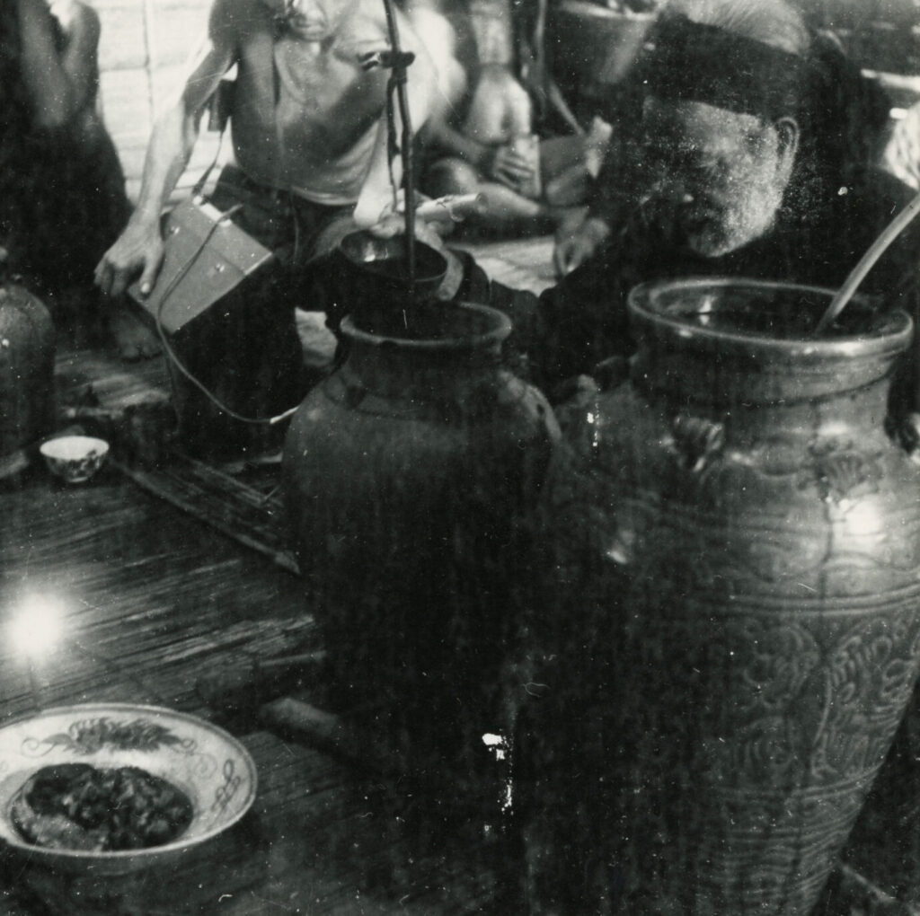 Autre matière à sacrifice offerte en libation : la bière de riz, agrémentée de végétaux stupéfiants. Les yangs sont invités à joindre le cercle des buveurs autour de la jarre, à consommer l’apaisant liquide par le chalumeau de bambou qui leur est réservé, au son des mélopées rituelles.